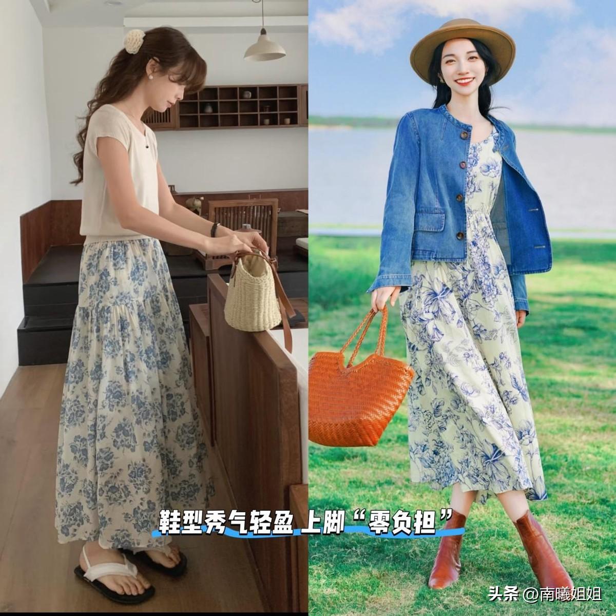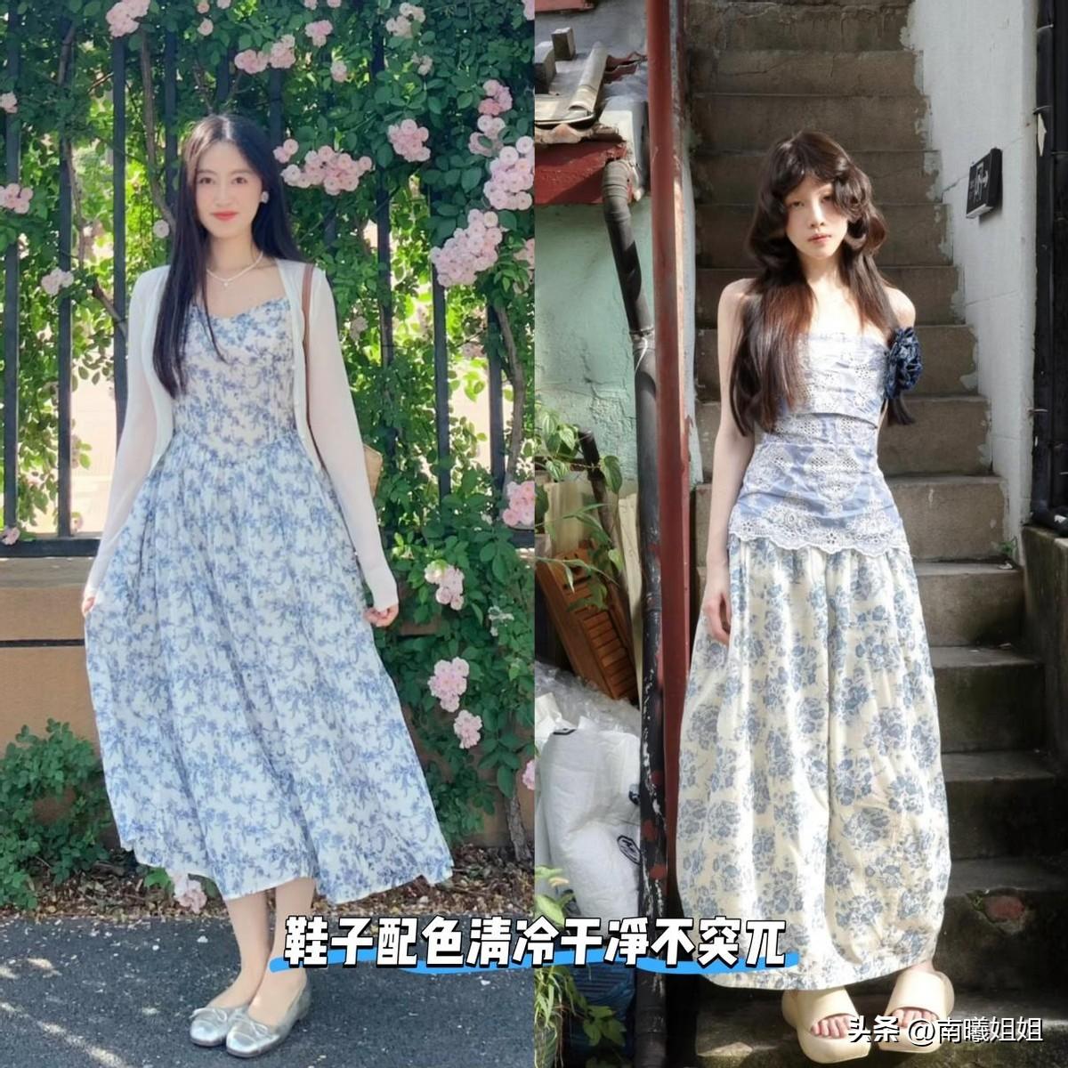 選擇更加精巧輕便的小白鞋、踝靴、平底涼鞋,不僅透氣性好,穿在腳上也沒有負擔,可以烘托出青花瓷裙的浪漫氛圍,關鍵是走起路來也更輕鬆。