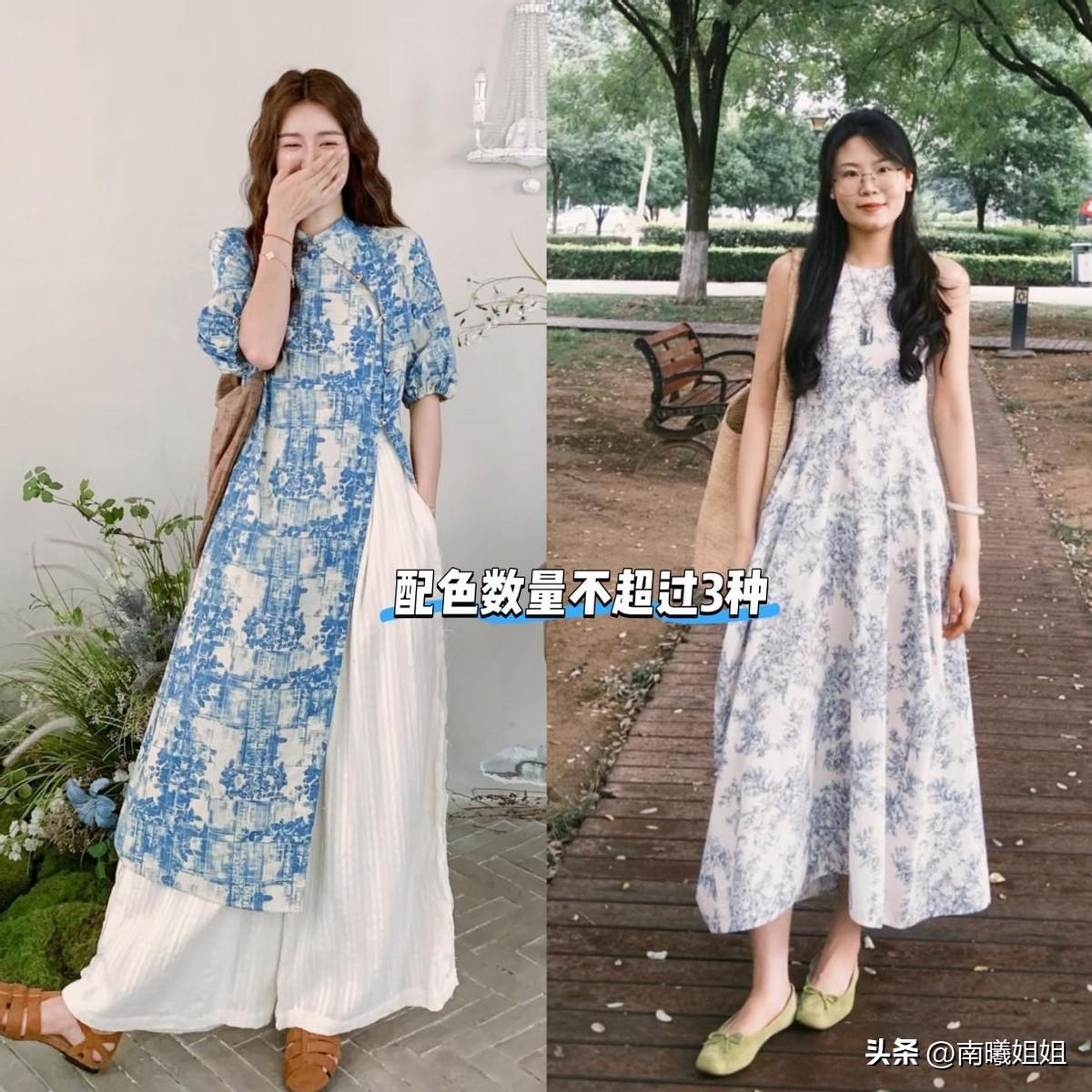 尤其是青花瓷連衣裙,建議搭配大地色系的配飾和鞋子,或者是選用清新一點的淺亮色,比如牛油果色、淡粉色、奶油黃,小面積點綴,和藍色形成撞色的效果,高級又顯白。