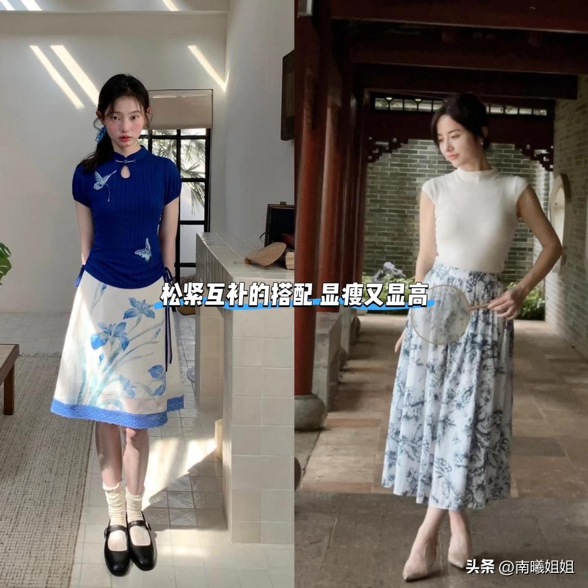 想要將青花瓷半裙穿出好身材,建議可以搭配修身一點的新中式T恤,整體風格統一,看上去更協調,“鬆緊互補”的關係,又能巧妙的掐出腰線,搭配瑪麗珍鞋、尖頭鞋都好美。