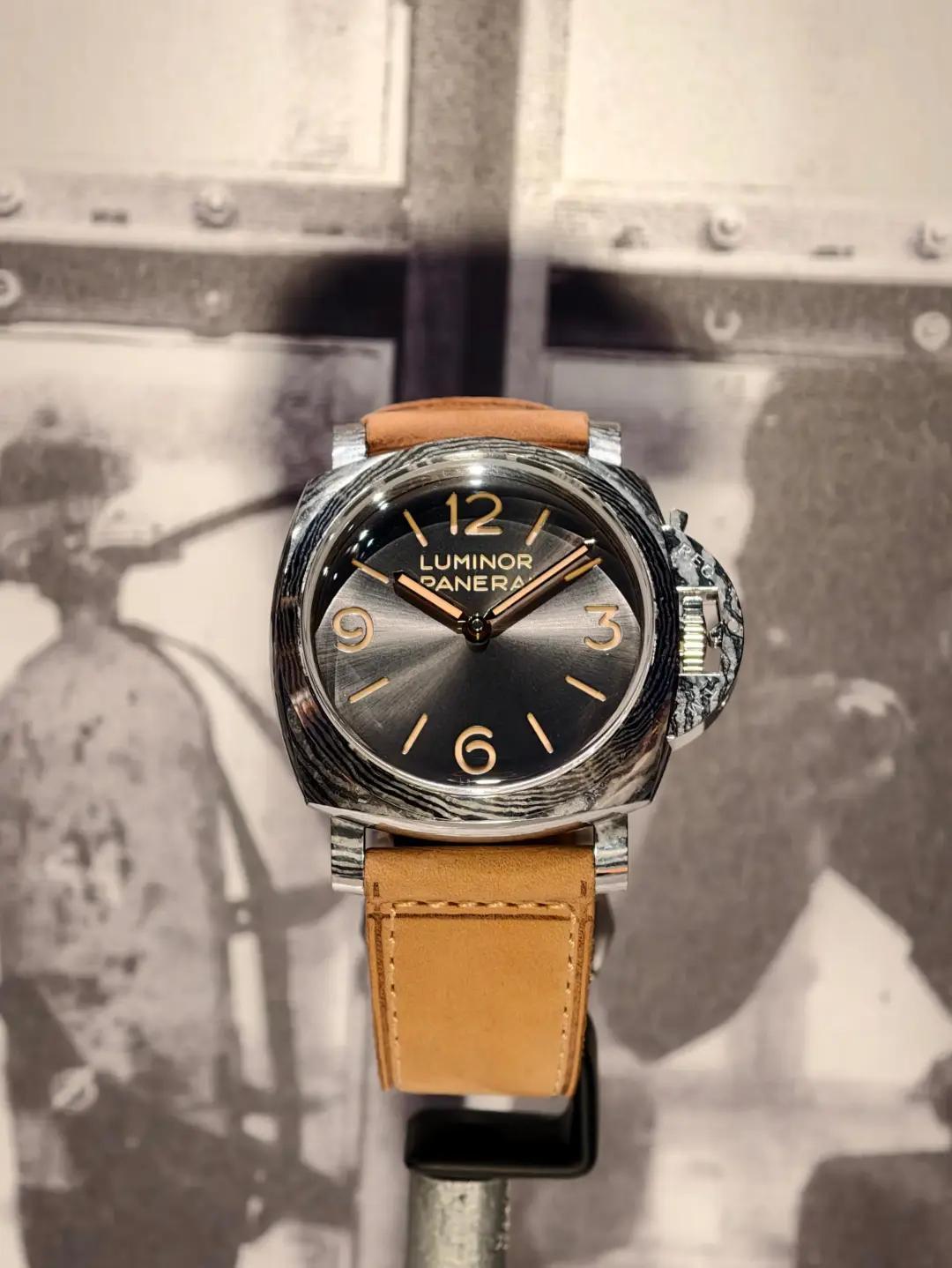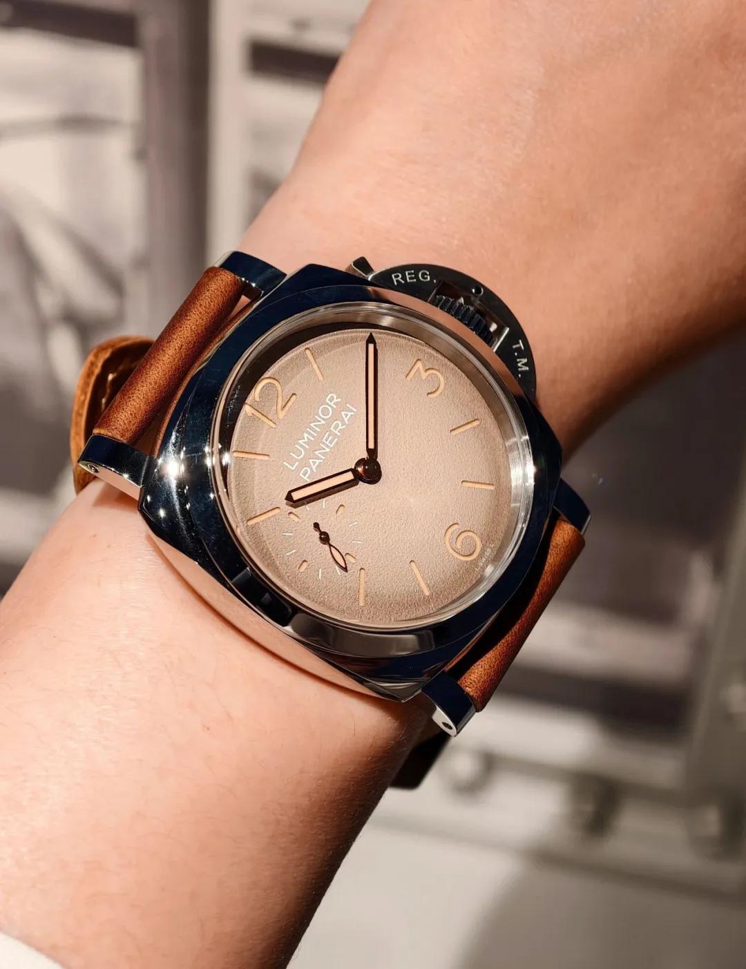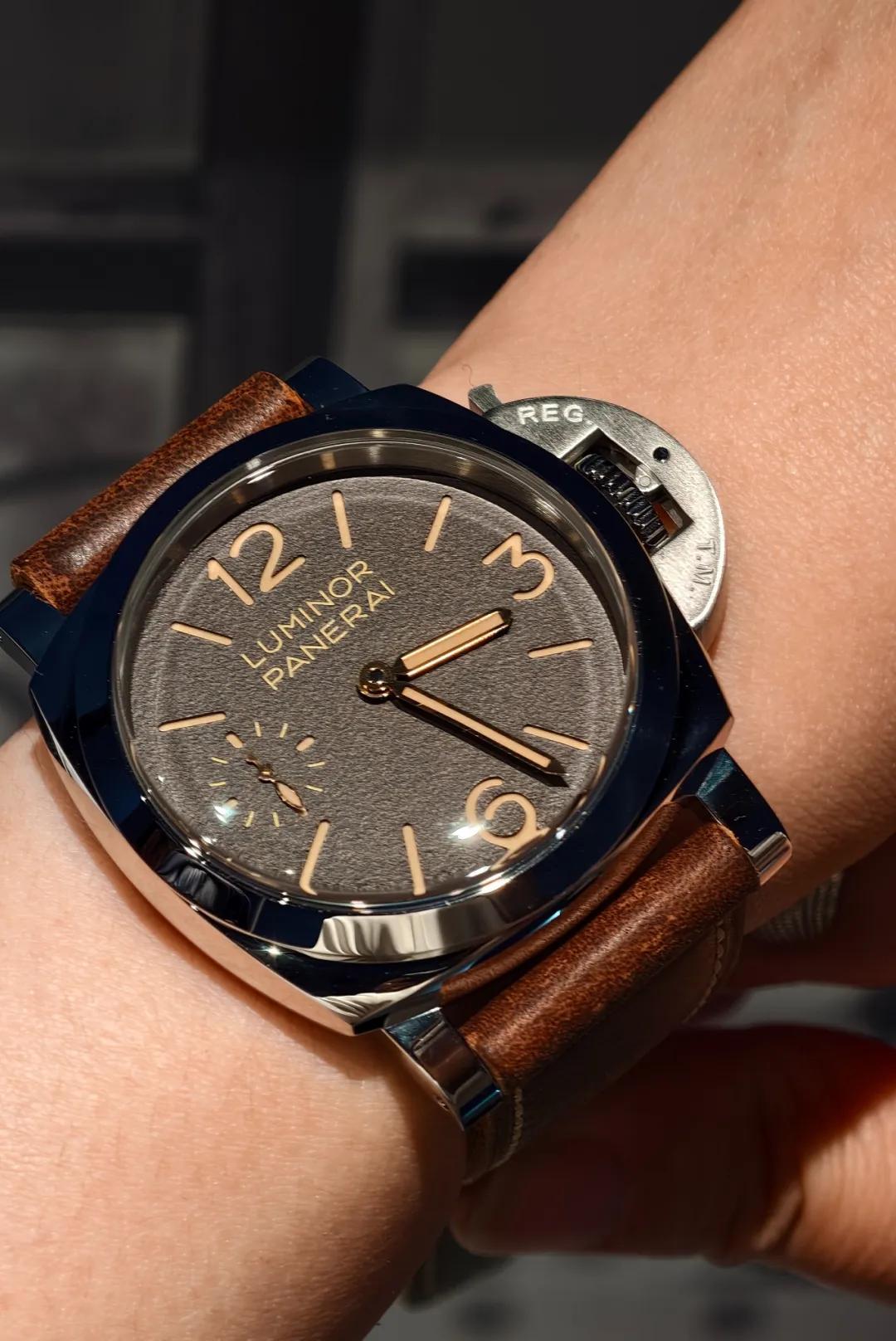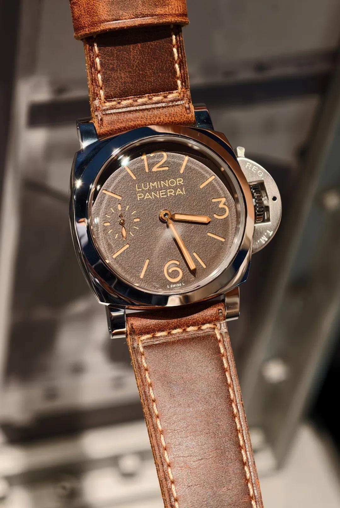今年這枚Luminor手動8日鏈PAM01733就以Brunito做舊的姿態登場。邊緣圓潤,接觸處自然褪色,復古質感十分出色。