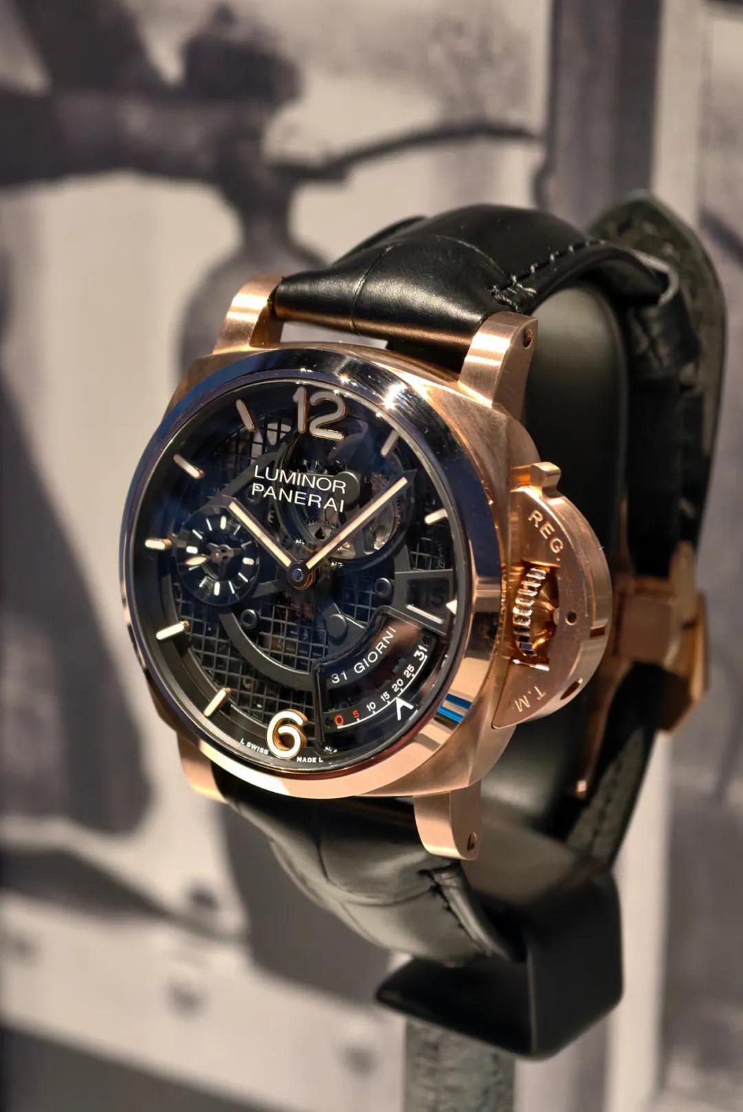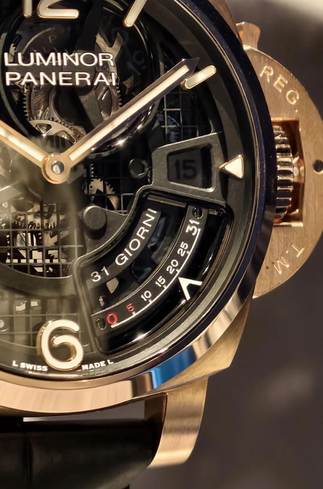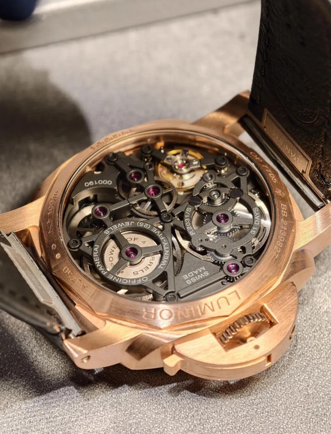 這枚表搭載的P.2031/S鏤空機芯,擁有4個發條盒,容納主彈簧總長達3.3米!沛納海通過微米級的精密佈局,將其放進經典的44毫米錶殼內,實現了一場空間魔術。