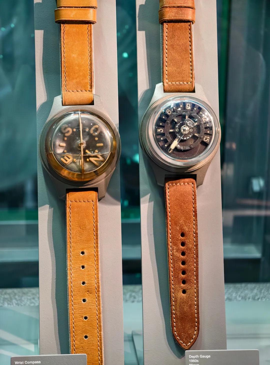 現場還展出了潛水員使用訓練池的老照片,以及沛納海打造的古董指南針、深度計等輔助儀器,讓人一秒聯想到沛納海與海洋的淵源。