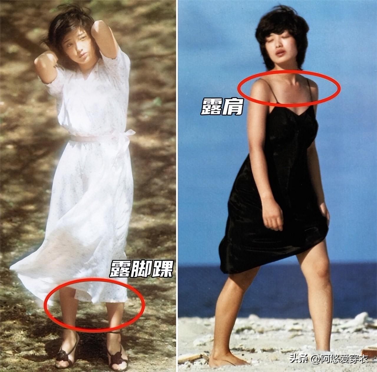 此外,適度地露膚也是十分有必要的,年輕時候的山口百惠在穿搭方面也很大膽,露肩、露腿等搭配都可以釋放出女性的魅力,不但沒有暴露感,還可以凸顯出女人味,比現在好多的年輕女孩還要敢穿。