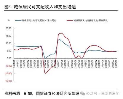 8月20號,國信證券王劍發表了一篇文章《存款搬家如何演繹》,裏面有一張圖明確顯示,城鎮居民可支配收入和支出的增速相關性極強,可支配收入的增速上升了,居民的消費也會上升,反之亦然。