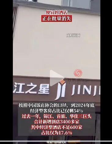 11月3日,鳳凰網財經發布了一則視頻《便宜的酒店正在批量消失》,按照中國飯店協會的口徑,到2024年底經濟型客房佔比僅剩54%,過去一年,錦江、首旅、華住三巨頭合計新增酒店3400多家,其中經濟型酒店不足600家,佔比僅爲17.6%。