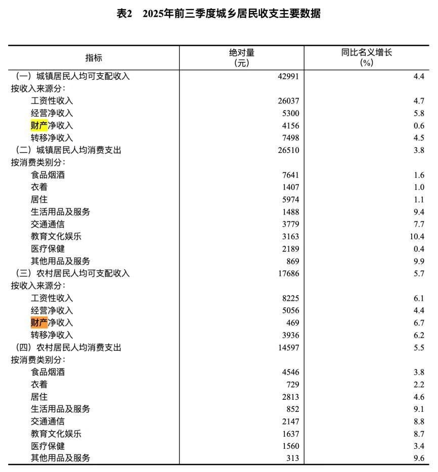 前三季度,城鎮居民的財產淨收入增速僅爲0.6%,在四個主要收入來源裏增速最低,且佔比也最低。這意味着,除了部分股民,多數城鎮受困於房產價值的縮水,受益於股市增值影響的微乎其微。