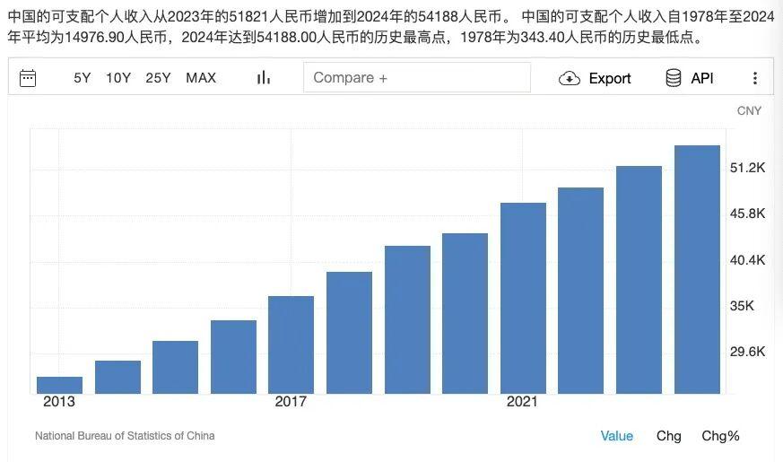 收入雖然還在上升,但增速在下降。2013年,個人可支配收入爲2.7萬元人民幣,2014年爲2.88萬元人民幣,增速約爲6.67%;2023年爲5.18萬元人民幣,2024年爲5.42萬元人民幣,增速約爲4.6%。
