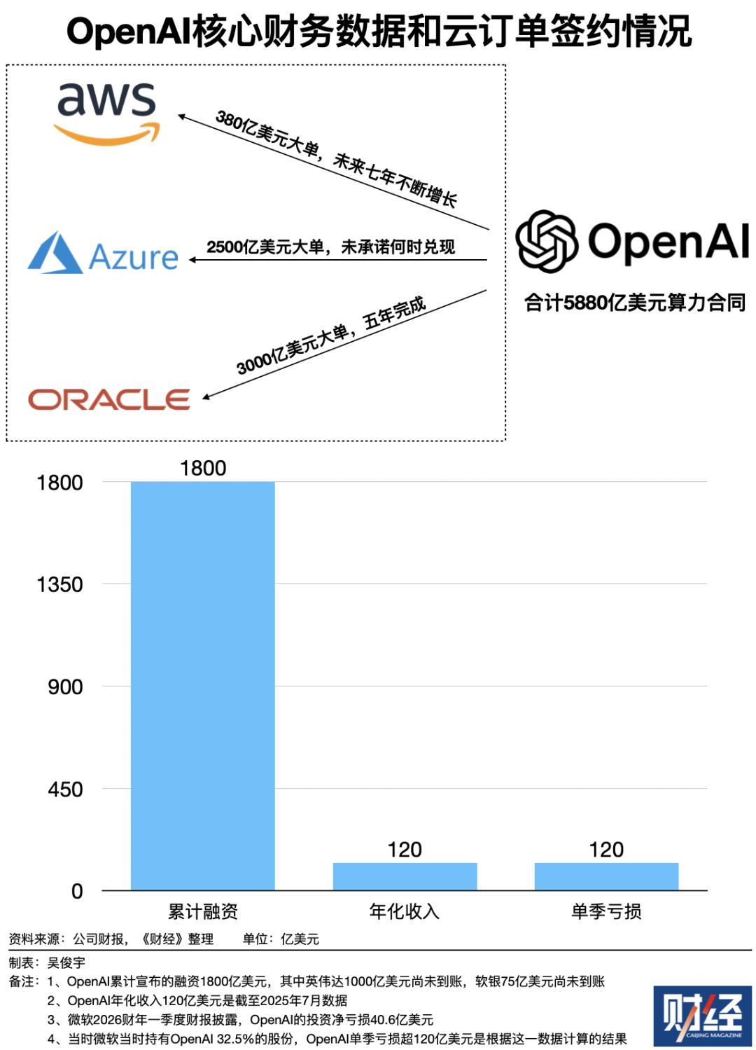 近兩個月,OpenAI和微軟、甲骨文、亞馬遜共簽署了5880億美元算力大單(甲骨文5年3000億美元、微軟2500億美元、亞馬遜7年380億美元)。多位行業人士對《財經》表示,OpenAI能否兌現並落地近6000億美元的大單,是擺在面前的第一個問題。
