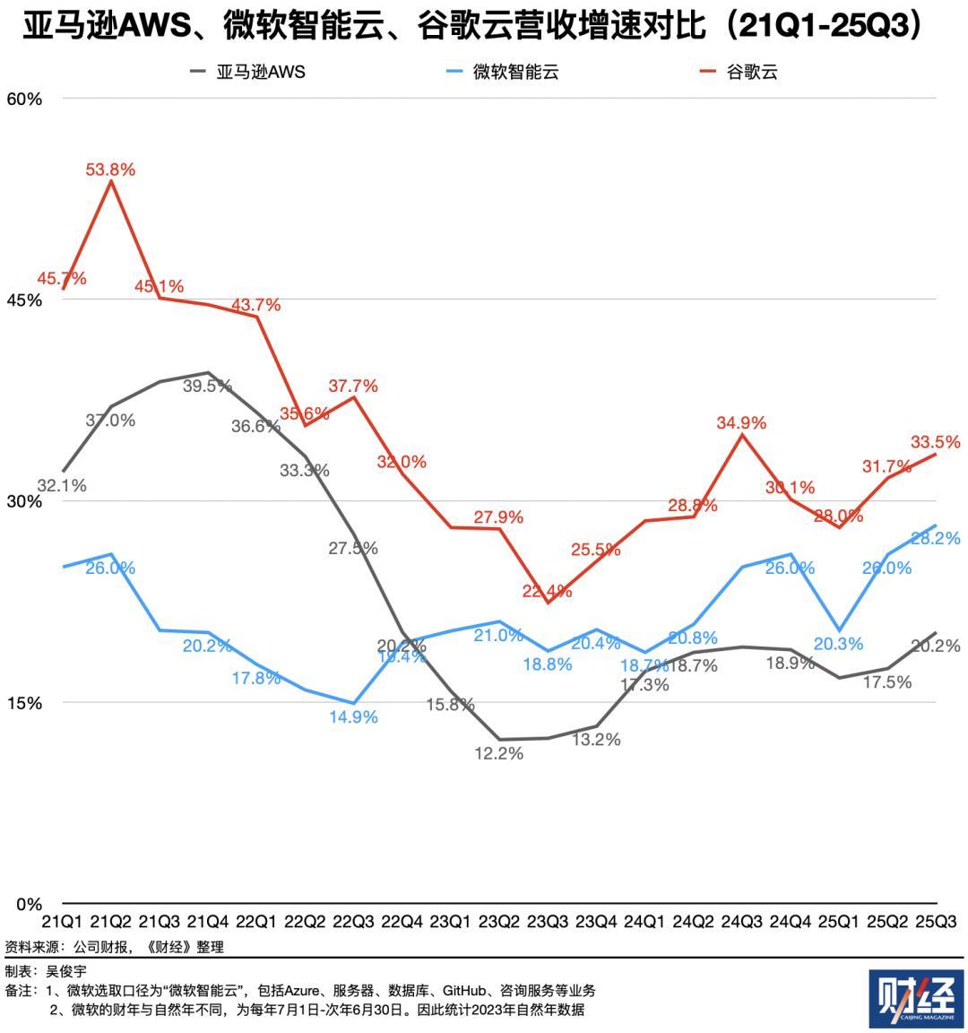這也意味着,未來幾個季度,亞馬遜AWS的業績將因此受益。財報顯示,2024年亞馬遜AWS營收1076億美元,同比增長18.5%。2025年,隨着生成式AI浪潮落地加速,亞馬遜AWS的營收增長還在加快。2025年三季度,亞馬遜AWS營收330億美元,同比增長20.2%。這一增速是三年來(2022年四季度至今)的最高點。