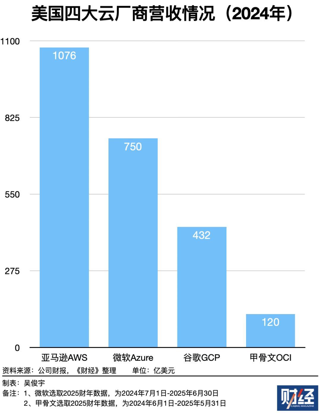 財報顯示,亞馬遜2024年營收1076億美元,微軟Azure 750億美元(2025財年營收,即2024年7月1日-2025年6月30日,包括微軟Azure,還包括服務器操作系統許可證、數字化諮詢服務等傳統業務),谷歌GCP 432億美元,甲骨文OCI 120億美元(2025財年營收,即2024年6月1日-2025年5月31日)。