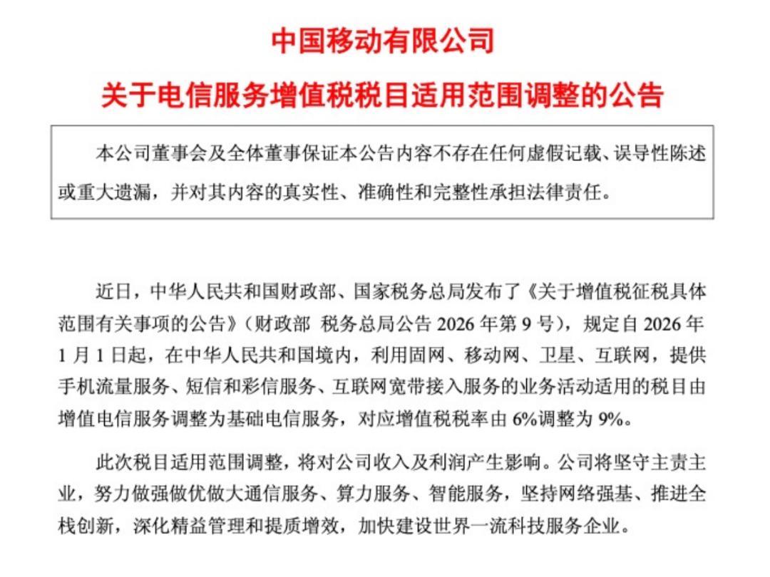 公告顯示,近日,財政部、國家稅務總局發佈《關於增值稅徵稅具體範圍有關事項的公告》(財政部 稅務總局公告2026年第9號),規定自2026年1月1日起,在中華人民共和國境內,利用固網、移動網、衛星、互聯網,提供手機流量服務、短信和彩信服務、互聯網寬帶接入服務的業務活動適用的稅目由增值電信服務調整爲基礎電信服務,對應增值稅稅率由6%調整至9%。同時,三大運營商均在公告中提及,此次增值稅稅目適用範圍調整,將對公司收入和利潤產生影響。