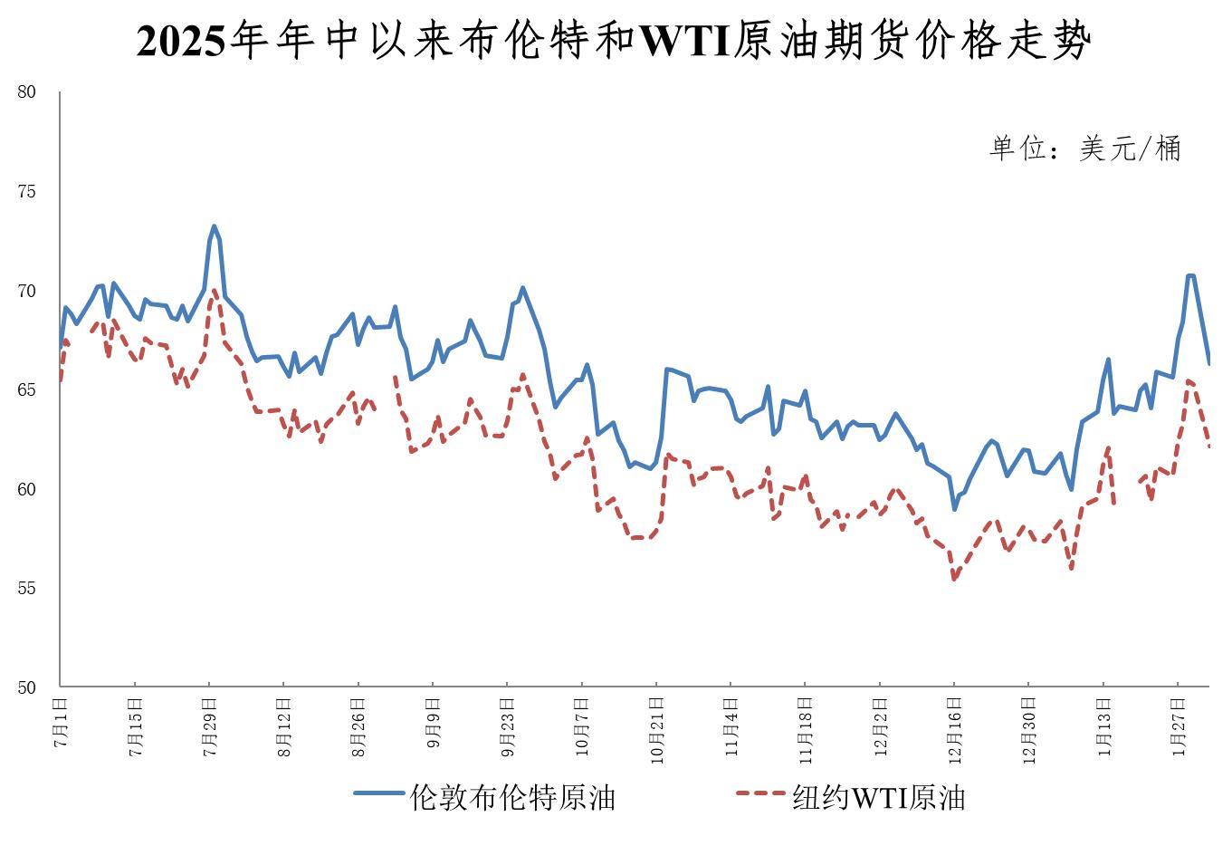 調價週期內,受地緣政治局勢變化、美國風暴天氣影響生產等因素影響,國際油價先升後降,平均水平較上一輪調價週期上漲。期初,美國加大對伊朗施壓力度,宣佈向伊朗派遣艦隊,並對運輸伊朗石油的船隻實施更多制裁,地緣風險溢價上升。同時,美國遭遇冬季風暴天氣,原油產量與出口受到制約,墨西哥灣沿岸原油出口大幅下降,商業原油庫存持續減少。受上述因素推動,布倫特原油期貨價格一度突破每桶70美元。期末,隨着美伊計劃開展談判,地緣政治緊張情緒短期內得到緩解,國際油價大幅回落。目前布倫特原油期貨價格降至每桶66美元左右。