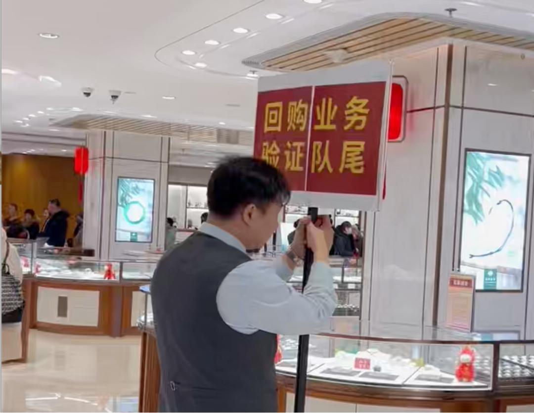 一名商場工作人員手舉“回購業務驗證隊尾”的牌子在現場維持秩序。據其介紹,從接近電梯口的隊尾開始排隊,預計需要兩個小時才能開始辦理回購業務。