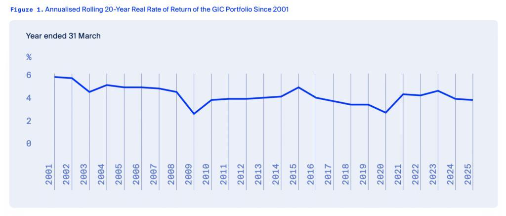 根據GIC在2025年7月25日發佈的最新年報《2024-25政府投資組合管理報告》,截至2025年3月31日,GIC 20年維度的實際年化回報率爲3.8%,基本可以對應公積金的利息承諾。