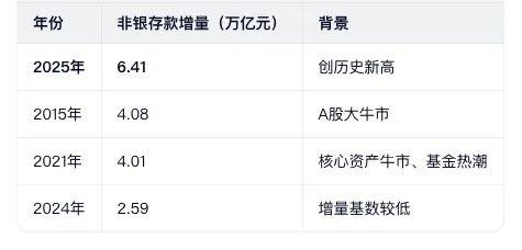 根據央行的數據,2015年至2025年,僅2015年、2021年及2025年非銀行業金融機構存款增量超過4萬億元,2025年大爆發,規模站上6萬億元。