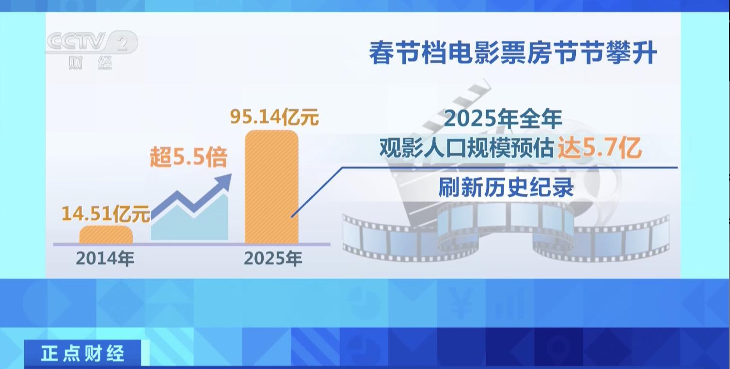 數據顯示,十多年來,春節檔票房節節攀升,從2014年的14.51億元到2025年的95.14億元,增長超5.5倍;2025年全年觀影人口規模預估達5.7億,刷新歷史紀錄。業內人士認爲,龐大的觀影基數爲2026年春節檔奠定了堅實基礎。