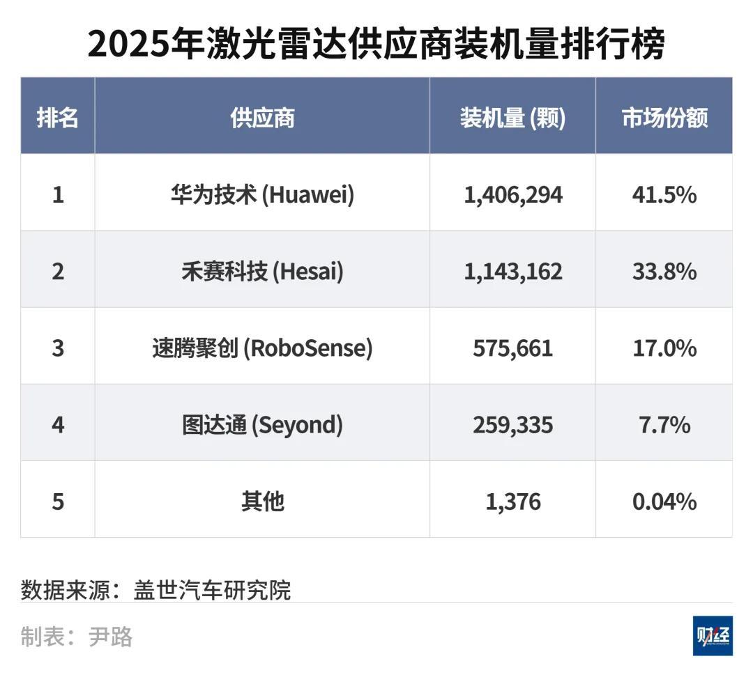 在中國的智能駕駛相關供應鏈中,華爲已成爲關鍵廠商之一。根據蓋世汽車研究院發佈的2025年零部件裝車量統計,華爲在激光雷達市場以41.5%的份額居於榜首。