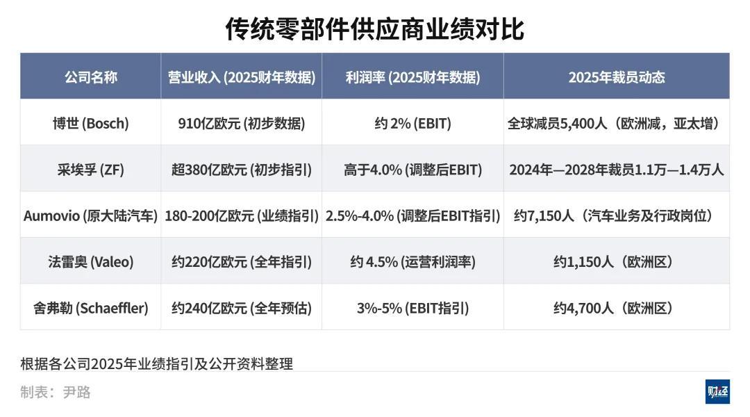 博世的“痛苦”不是個例。2024年—2025年,傳統汽車零部件供應商巨頭無一例外都陷入了利潤下滑和裁員重組的泥潭。採埃孚(ZF Group)計劃裁員逾萬人,大陸集團(Continental AG)進行了重大拆分,保留利潤率超過10%的輪胎業務,而低利潤的汽車業務則拆分爲Aumovio,法雷奧(Valeo)和舍弗勒(Schaeffler Group)則紛紛收縮歐洲戰線。
