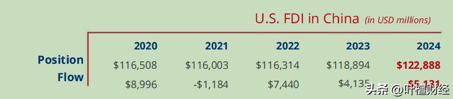 根據美國SELECTUSA網站的統計,2022年以來,美國企業對華FDI其實一直在增長,2024年存量投資已經提高到1228億美元,當年淨流入量爲51億美元。