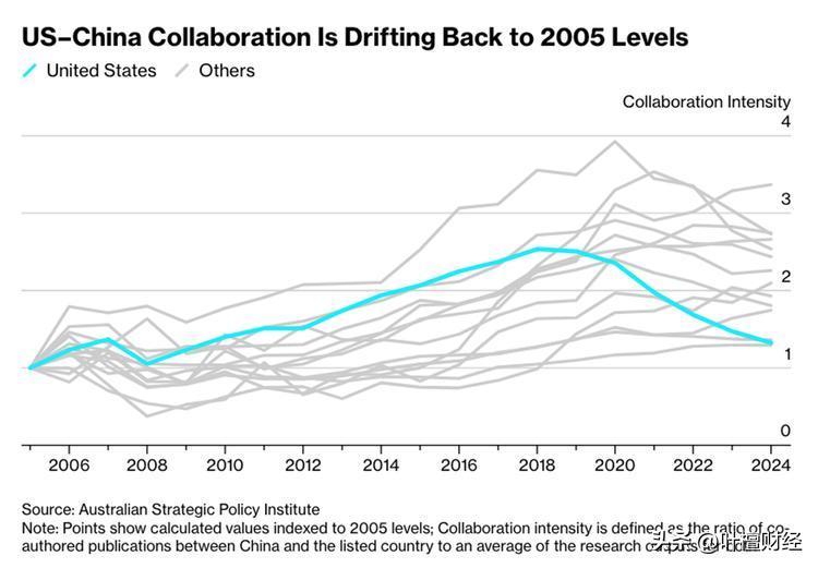據澳大利亞戰略政策研究所的報告,2018年美國司法部啓動“中國倡議”後,對涉及國家安全的審查大幅度增強,諸多科技合作從此終止,中美在關鍵技術上的研究合作強度急劇下降。