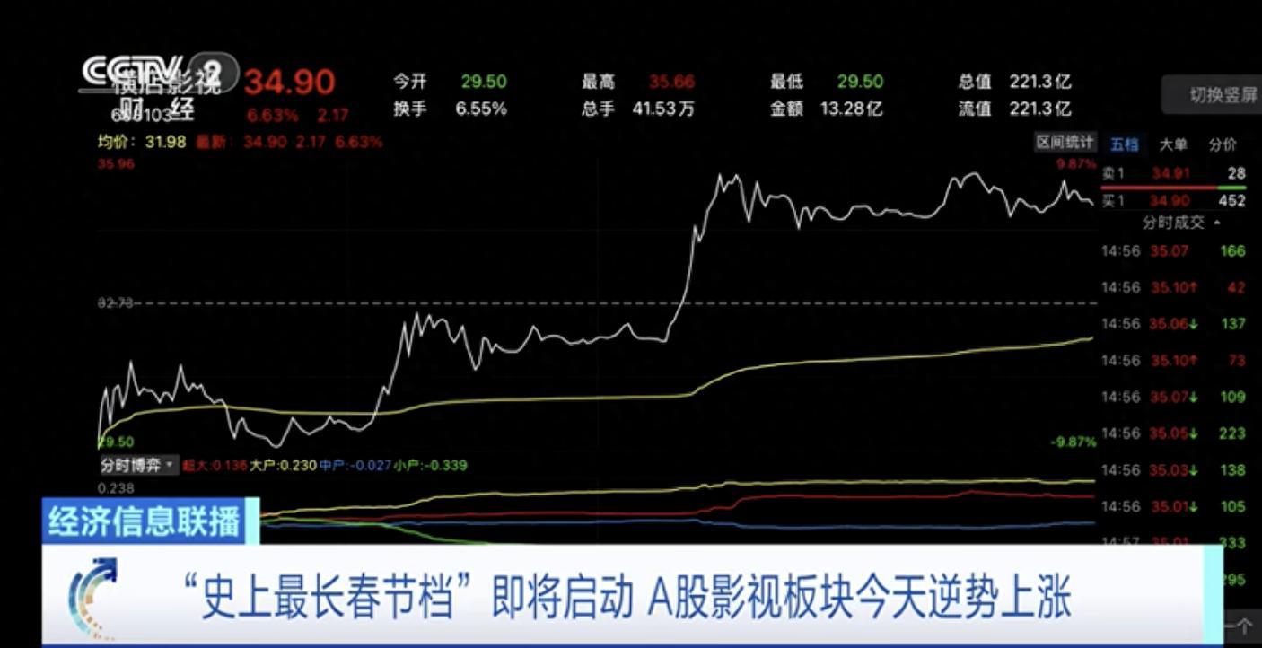 (央視財經《經濟信息聯播》)2026年春節假期長達9天,電影“春節檔”有效放映天數創歷史新高。據網絡平臺數據顯示,截至今天(2月13日)16時36分,2026“春節檔”新片預售總票房突破2億元。A股影視板塊今天逆勢拉昇,表現亮眼。