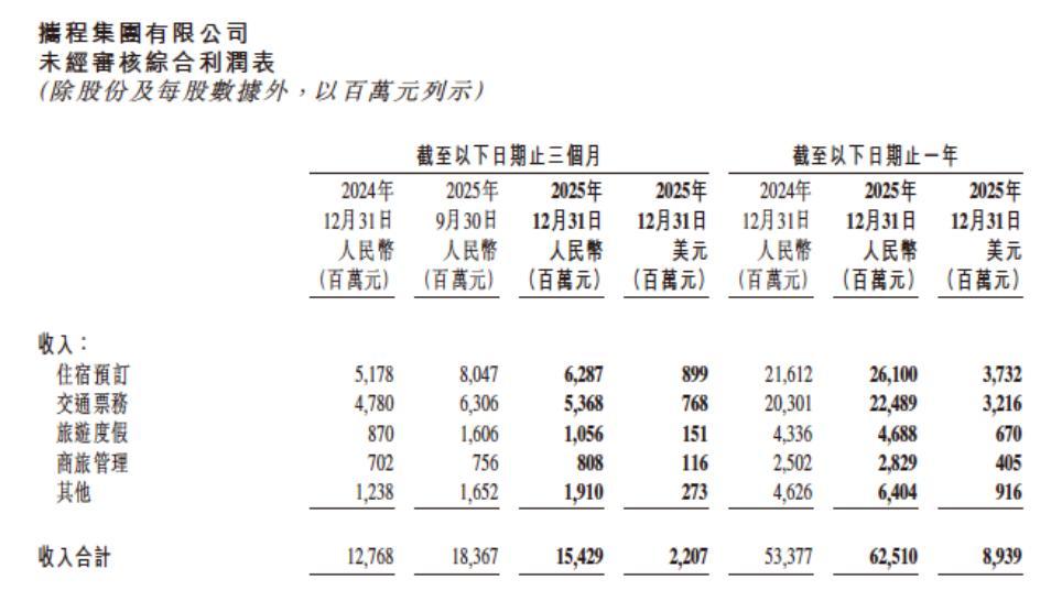 攜程集團2024年和2025年收入分佈 表/攜程財報