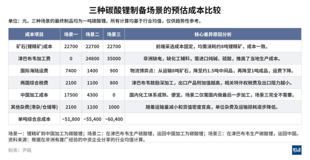 在津巴布韋建廠到底值不值,《財經》根據在非洲有建廠經驗的企業提供的行業均值,以一噸碳酸鋰爲最終制成品,分三類場景的成本估算如下:
