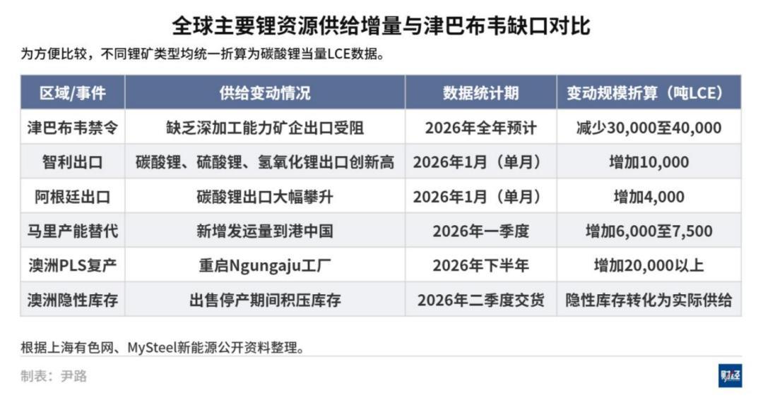 短期內,全球其他供給國的增產足以填補這一缺口。智利和阿根廷的鹽湖產能大幅放量,智利2026年1月鋰化學品出口創歷史新高;澳大利亞PLS公司宣佈重啓Ngungaju工廠,當地鋰礦積極重返市場;非洲本土如馬裏等國家的產能穩定釋放;且全球鋰價回暖刺激了澳洲的隱性庫存轉化爲實際供給。