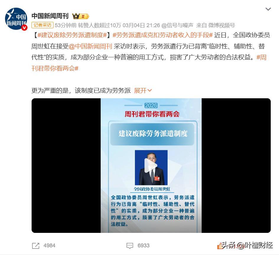 兩會開幕的第二天,#建議廢除勞務派遣制度#的話題衝上熱搜,閱讀量迅速破億。