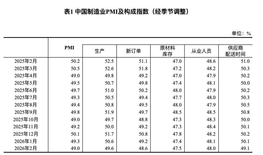 3月4日,統計局發佈2026年2月份的PMI,2月製造業PMI僅爲49.0%,環比1月份又少了0.3個百分點。
