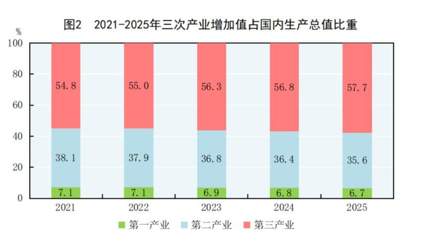 爲什麼中國服務業很重要?從中國經濟結構來看,以服務業爲主的第三產業佔比越來越高。據統計局數字,2025年中國第三產業佔比歷史性突破57%。