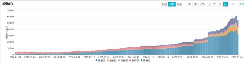 據虎嗅網3月3日文章,GJD主導的寬基ETF規模持續縮水,截至2月25日,全市場總規模爲5.43萬億元,相較於2025年底減少了6000億元,降幅達10%。