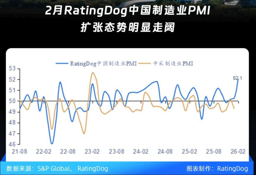 據標普RatingGog PMI,2月中國製造業PMI大幅上漲至52.1%,創五年多來新高。