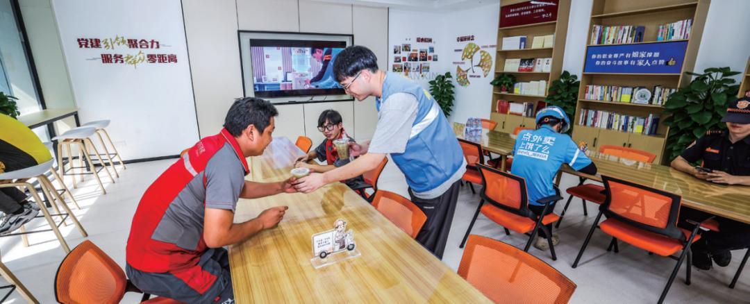 2025年8月26日,浙江省嘉興市,南湖區工會志願者在工會驛站爲休息的外賣騎手送上綠豆湯等清涼飲品。圖/新華
