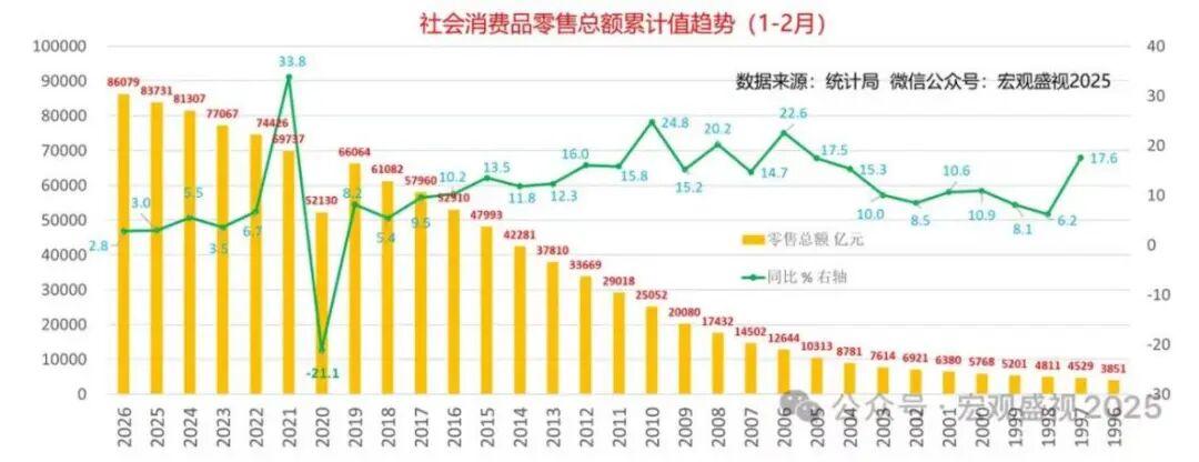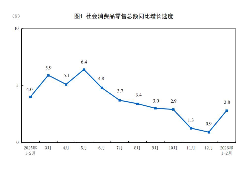 1月-2月,社會消費品零售總額同比增長2.8%,比2025年12月加快1.9個百分點。這一數據好於市場預期,此前多家機構對開年消費數據的預測均值爲2.4%左右。