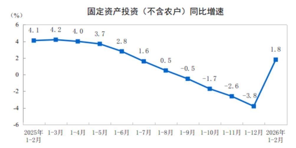 在經歷了連續四個月的負增長之後,投資出現了止跌回穩的跡象。1月-2月,全國固定資產投資(不含農戶)同比增長1.8%,2025年全年爲下降3.8%。