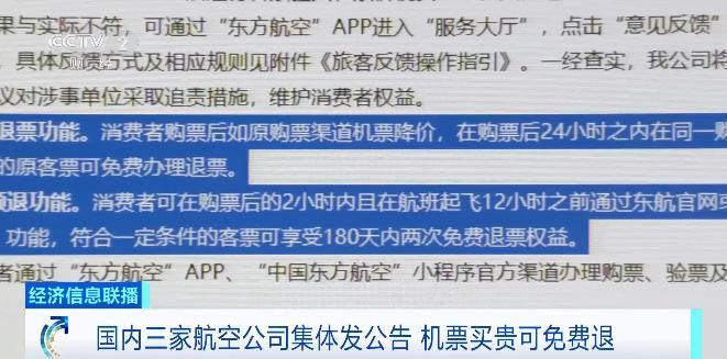 東航公告顯示:消費者購票後如原購票渠道機票降價,在購票後24小時之內在同一購票渠道重新購買新客票,符合一定條件的原客票可免費辦理退票。消費者可在購票後的2小時內且在航班起飛12小時之前,通過東航官方渠道使用“2小時全額退”功能。
