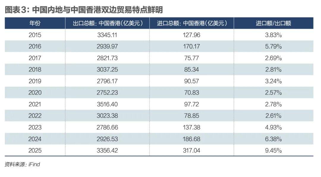 內地與香港之間的雙邊貿易額呈現鮮明特徵,內地對港出口遠超過從港進口。圖表3是2015年至2025年內地對香港的進出口數據。2025年內地對港出口額爲3356.42億美元,從港進口額爲317.04億美元、僅爲出口額的9.45%。這種不均衡特徵源於內地通過香港進行大量的轉口貿易。