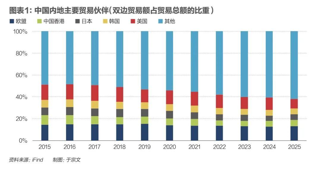 2015年至2025年中國內地主要貿易伙伴雙邊貿易額佔貿易總額的比重(見圖表1)。中國香港是內地重要的貿易伙伴。2000年以來,與中國香港的進出口貿易額佔內地整體貿易額的比重由11%左右降至約6%。2025年,與中國香港的貿易額佔內地整體貿易額的比重爲5.73%,僅次於歐盟(13.02%)、美國(8.95%)。