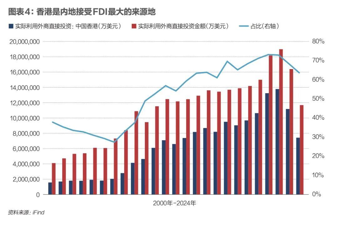 在資本“引進來”方面,香港長期扮演着內地吸收外商直接投資(FDI)的首要橋樑。數據顯示,內地約有六七成的直接投資通過香港進行。1997年迴歸後,來自香港的FDI規模持續增長,增速顯著超越其他所有來源地的總和。近十年來,香港提供的FDI在內地利用外資格局中佔據主導地位。