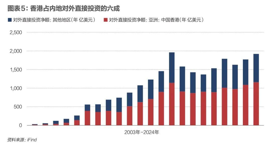 在資本“走出去”的進程中,香港同樣承擔着關鍵中轉功能。內地企業對外直接投資(ODI)亦大量通過香港進行佈局與調度,以利用其國際化的金融環境、法律保障和稅務安排。圖表5是2003年至2024年內地對香港和其他地區的直接投資淨額。這不僅反映香港作爲投資目的地的價值,更凸顯其作爲資金出海、配置全球資產的重要平臺作用。