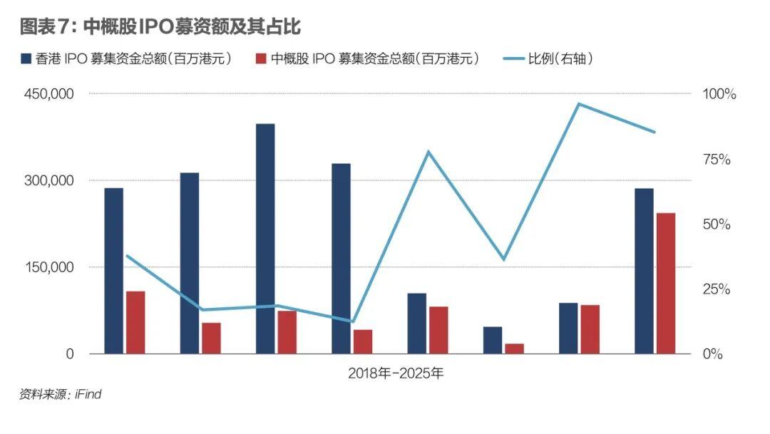 圖表7是中概股IPO募資額及其佔比。中概股IPO在整個香港IPO中佔較大比重。2025年,118家企業在香港上市,其中中概股企業110家,佔香港總IPO的93%;中概股IPO融資額爲2433億港幣,佔香港市場IPO融資額的85%。截至2025年12月,累計共有1552家中概股在港股市場上市。
