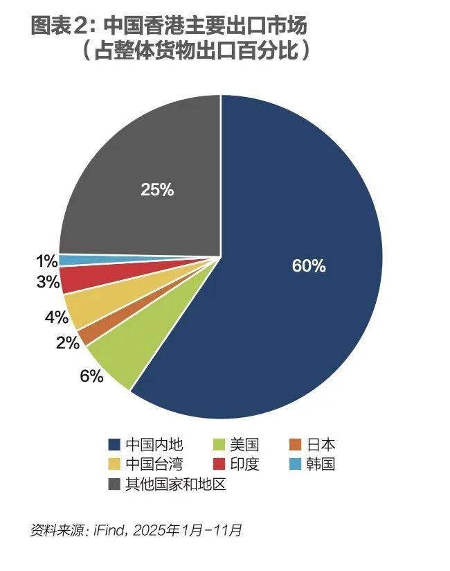 中國香港貨物出口中,電子產品佔比高達72.8%。這並非指香港本地大量生產電子產品,而是凸顯了其作爲全球電子產品貿易關鍵樞紐的角色。香港的出口貿易是典型的轉口貿易模式,其競爭力建立在高效的物流、通關和金融服務上,而非本地生產能力。圖表2是香港主要出口市場佔整體貨物出口百分比。香港出口至中國內地的市場佔比高達60%,說明內地是香港最核心的貿易伙伴。