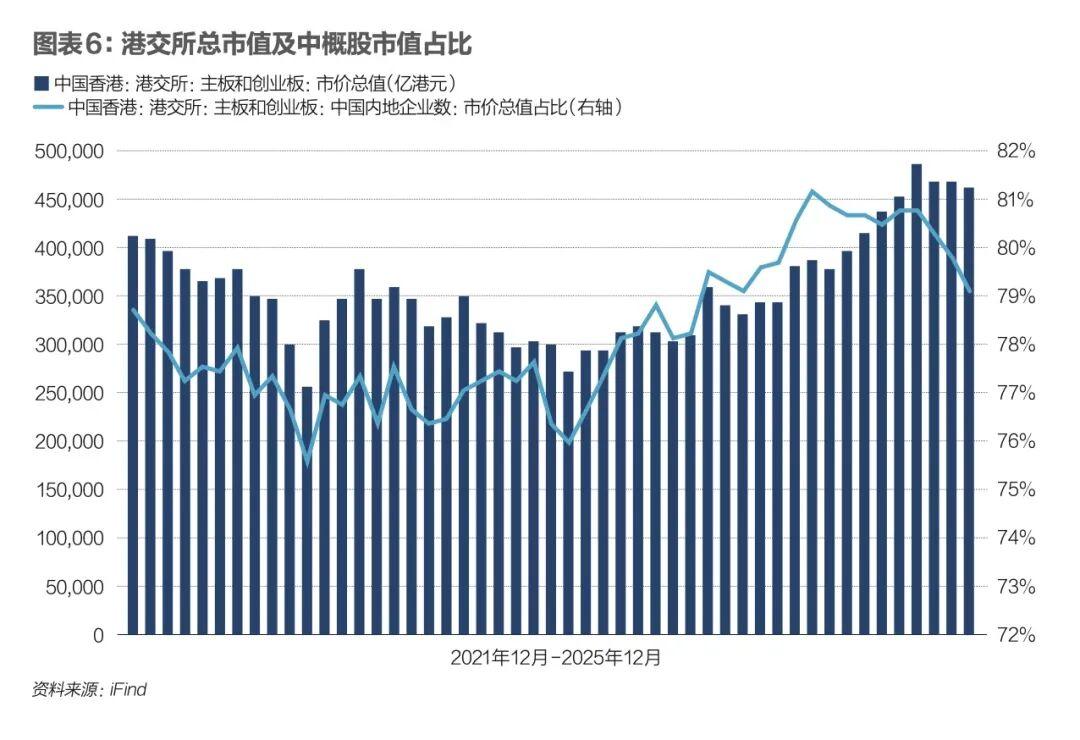 內地企業在港股市場中的佔比持續提升,香港市場的基本面日益與內地經濟緊密相連。圖表6是港股總市值及中概股市值佔比。至2025年12月底,香港有2686家上市公司,總市值47.4萬億港元,較2024年底升逾34%。其中,內地企業佔港交所主板創業板總市值的79.3%、佔整體成交金額比例達90.6%,均與2024年底基本持平。