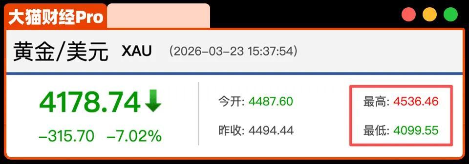 現貨黃金從震盪進入到連續下跌區間,3月23日,黃金暴跌,一度跌破4100美元/盎司,眼瞅着就奔着4000美元而去。