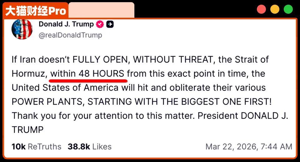 “如果伊朗不在48小時內開放霍爾木茲海峽,美國將打擊並摧毀他們的電廠”。