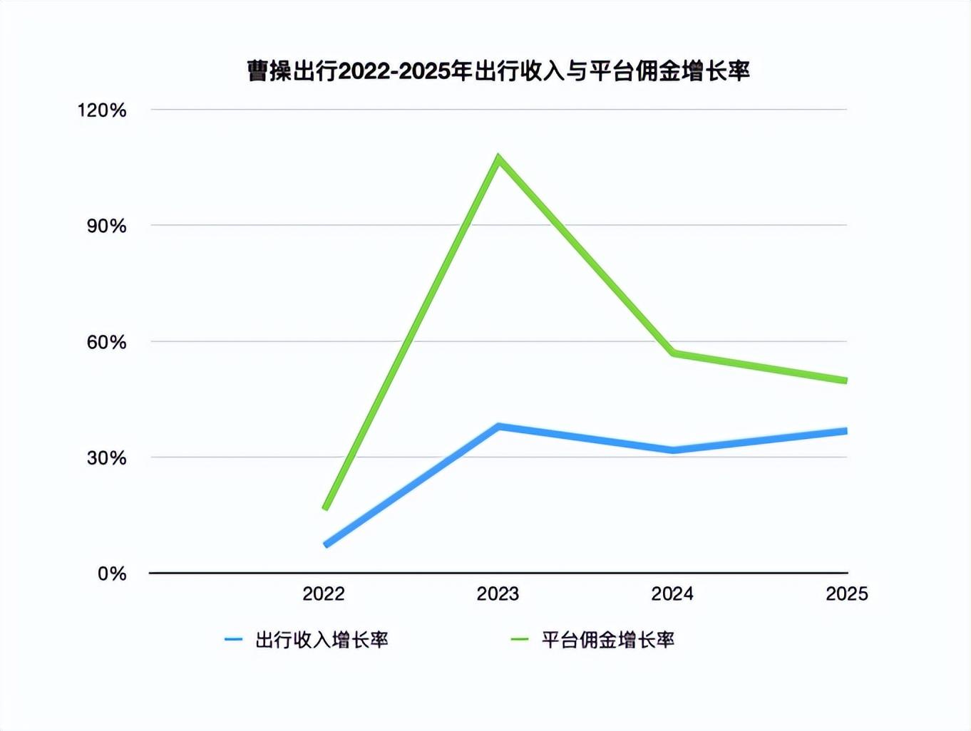 將時間線放長,可以看到二者之間並不對等的增長關係。2021年到2025年間,曹操出行每年支付的聚合平臺佣金從2.77億元增至15.65億元,累計增長約465%,年均複合增長率約54%;相比之下,同時期出行服務收入累計增長約166%,年均複合增長率約28%。