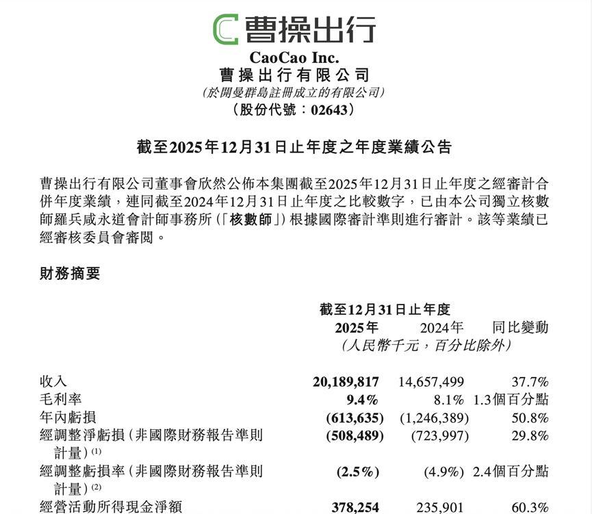 年報數據顯示,2025年曹操出行實現總收入202億元,同比增長37.7%;淨虧損6.14億元,較上年同期大幅收窄50.8%,經調整淨虧損率由從前一年度的4.9%下降至2.5%。值得注意的是,公司披露2025年四季度經調整後淨利潤已實現轉正,這是曹操出行成立以來首次實現季度盈利。