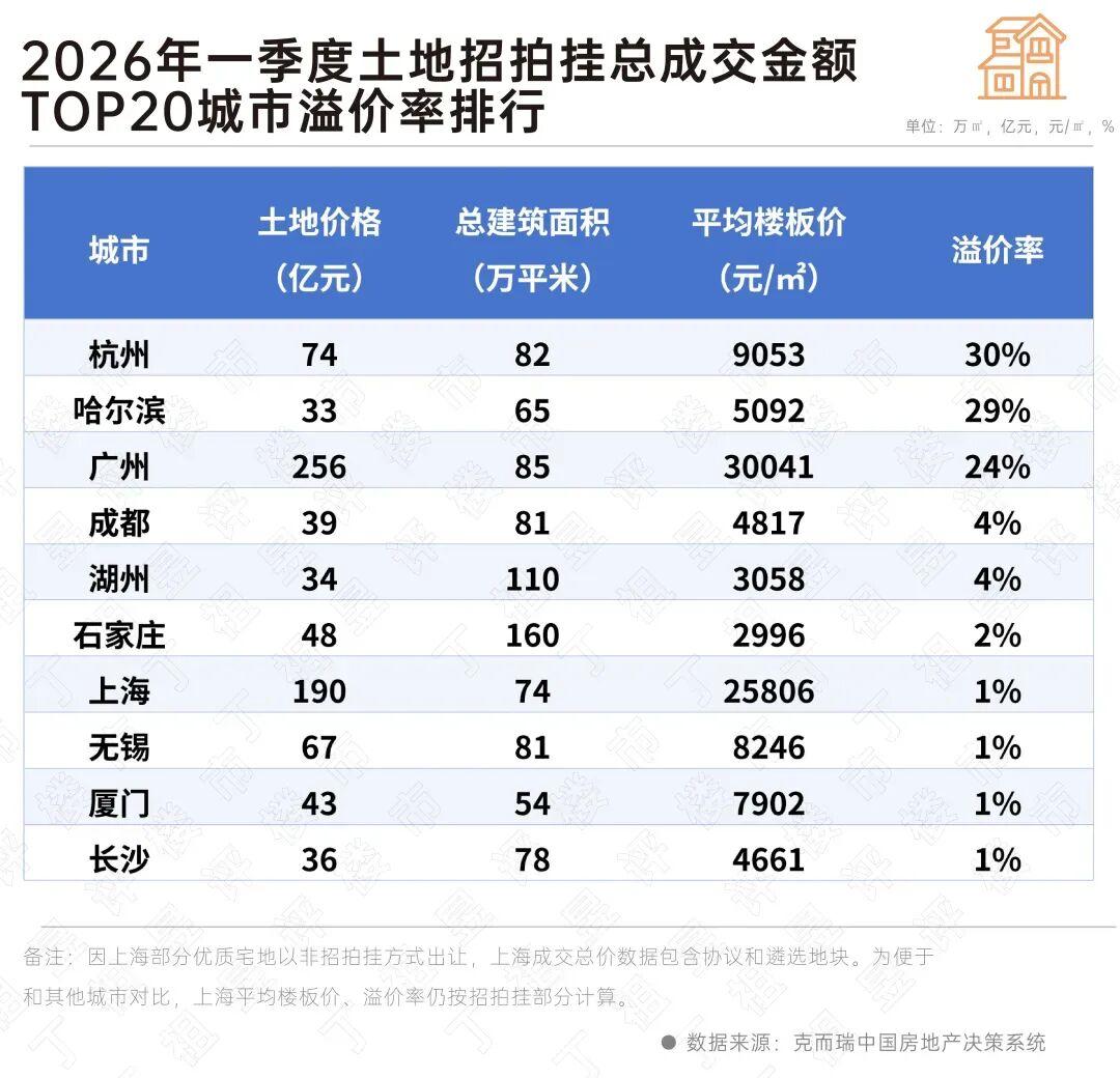據克而瑞統計,一季度杭州土拍溢價率最高,爲30%;其次是哈爾濱爲29%;成都、上海、石家莊也都在前列。