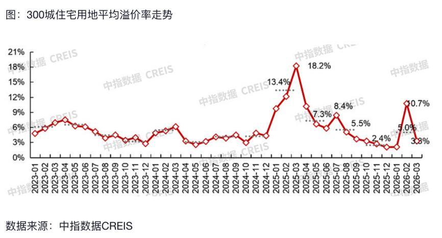 3月,300城平均土地溢價率僅爲3.8%,同比大幅回落;其中,一線城市爲11.4%,二線城市爲4.3%,三四線爲2.3%。